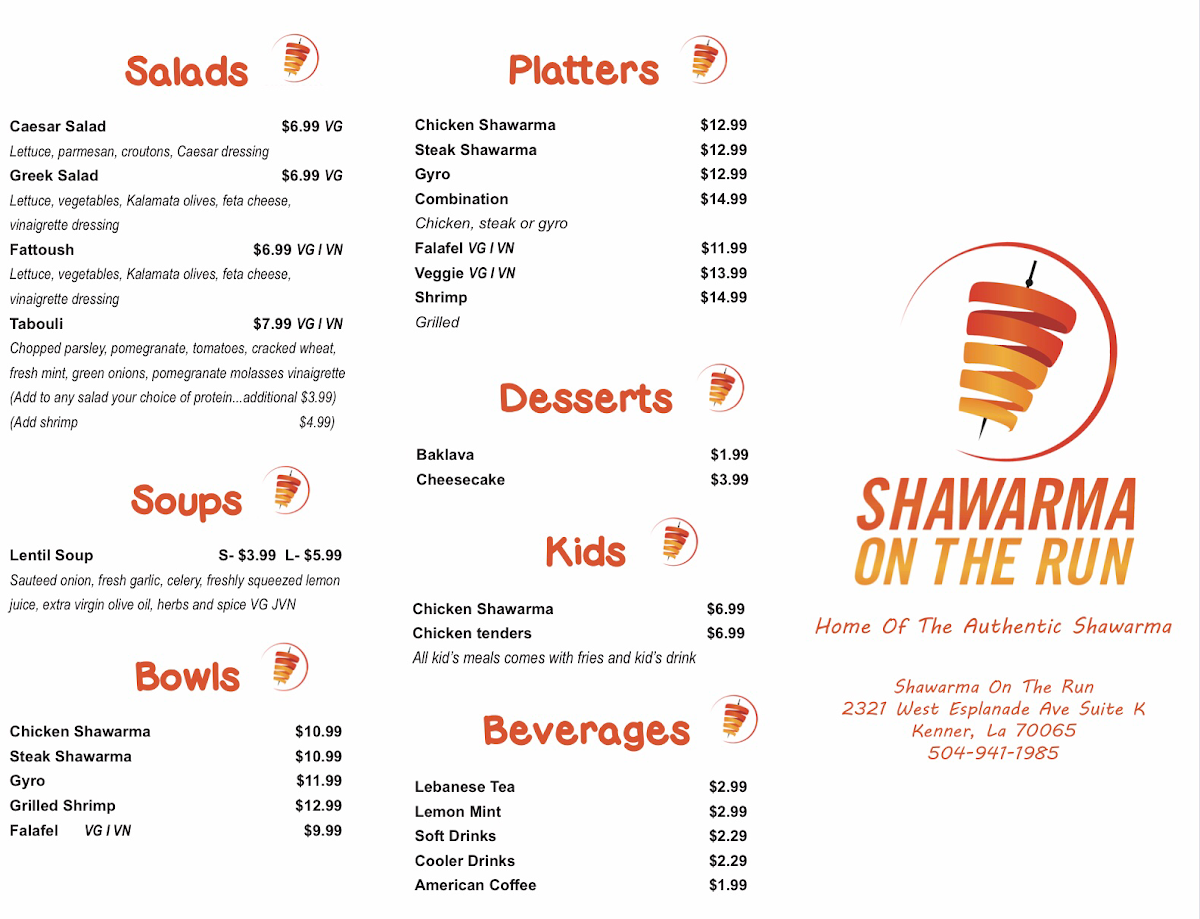 When you're in the mood for something flavorful and satisfying, look no further than Shawarma On The Run Menu. Located at 2321 W Esplanade Ave in Kenner, LA, this spot offers an irresistible selection of shawarma dishes that will have you coming back for more. From tender, spiced meats wrapped in soft pita to the perfect sides that complement each bite, there's something for everyone. The menu features a variety of options, whether you're craving chicken, beef, or lamb, all seasoned and grilled to perfection. Pair it with fresh salads, fries, or a side of hummus, and you've got a meal that hits all the right notes. It’s the perfect place to grab a quick, delicious bite whether you're dining in or taking it on the go.